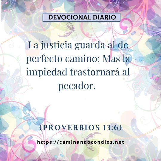 Proverbios 13 continúa el contraste entre el justo y el impío, destacando cómo la sabiduría produce vida, mientras que la necedad lleva a la destrucción. Se subraya la importancia de la disciplina, la prudencia en las palabras y la diligencia en el trabajo. El sabio acepta la corrección y se enriquece espiritualmente, mientras que el necio la rechaza y sufre las consecuencias. También enseña que la pereza conduce a la pobreza, pero la labor constante trae abundancia. En el hogar, se resalta el valor de la enseñanza y la corrección amorosa de los hijos. En el versículo 6 se afirma: “La justicia guarda al de perfecto camino; mas la impiedad trastorna al pecador.” Este proverbio muestra que la rectitud protege y afirma al justo, mientras que el pecado destruye al malvado. El capítulo enseña que vivir según la sabiduría de Dios trae seguridad, prosperidad y paz interior.