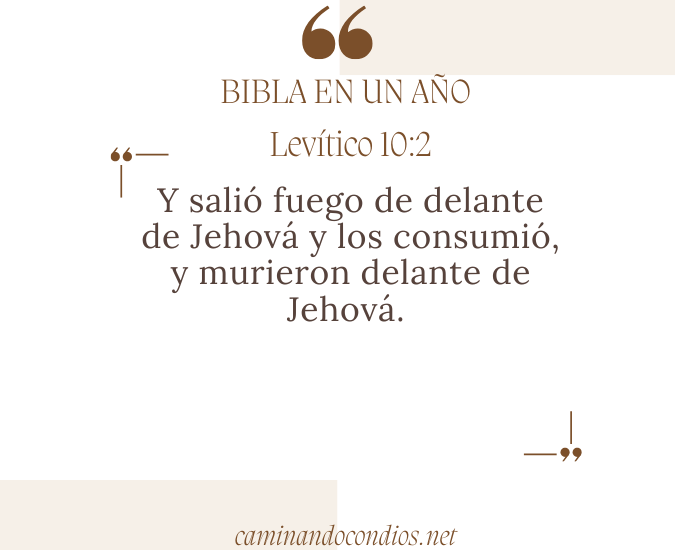 Este capítulo relata un acontecimiento solemne y trágico: Nadab y Abiú, hijos de Aarón, ofrecieron “fuego extraño” delante de Dios, es decir, un acto de adoración que Él no había ordenado. En respuesta, un fuego salió de la presencia del Señor y los consumió. Lo que debía ser un servicio santo se convirtió en un ejemplo del peligro de acercarse a Dios con irreverencia y desobediencia.
