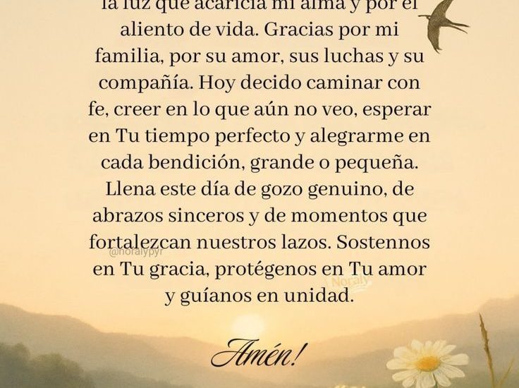 Hoy decido caminar con fe, creer en lo que aún no veo, esperar en Tu tiempo perfecto y alegrarme en cada bendición, grande o pequeña.