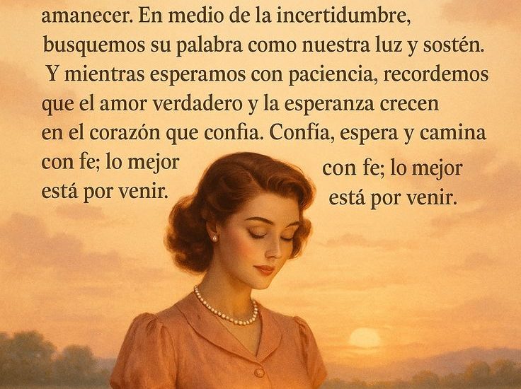 Aunque el mundo cambie y las sombras quieran envolvernos, Dios está transformando todo a su tiempo. Él quita lo que nos hace daño, purifica nuestro camino y nos guía hacia un nuevo amanecer. En medio de la incertidumbre, busquemos su palabra como nuestra luz y sostén. Y mientras esperamos con paciencia, recordemos que el amor verdadero y la esperanza crecen en el corazón que confía. Confía, espera y camina con fe; lo mejor está por venir.