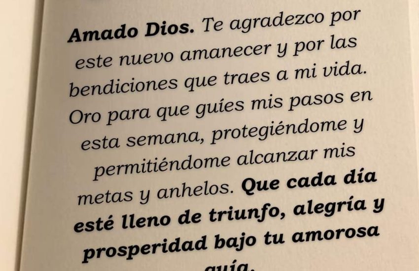 Señor, permítenos despertar cada día llenos de fuerza, vitalidad y entusiasmo para poder luchar por nuestros objetivos, no asientas que nos perdamos en las penumbras de la desesperación y la desesperanza y siempre cúbrenos con tu maravilloso manto de protección.