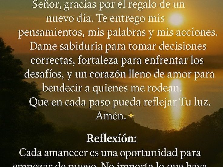 Señor, permítenos despertar cada día llenos de fuerza, vitalidad y entusiasmo para poder luchar por nuestros objetivos, no asientas que nos perdamos en las penumbras de la desesperación y la desesperanza y siempre cúbrenos con tu maravilloso manto de protección.