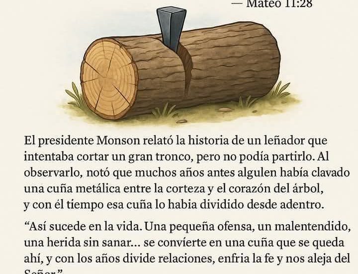 El presidente Monson relató la historia de un leñador que intentaba cortar un gran tronco, pero no podía partirlo. Al observarlo, notó que muchos años antes alguien había clavado una cuña metálica entre la corteza y el corazón del árbol, y con el tiempo esa cuña lo había dividido desde adentro.