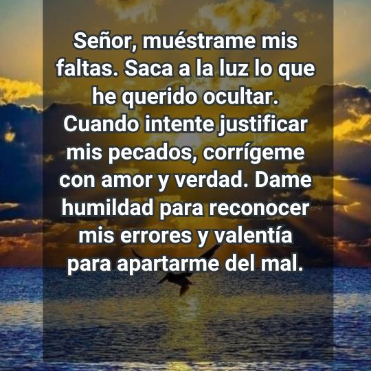 Señor, muéstrame mis faltas. Saca a la luz lo que he querido ocultar. Cuando intente justificar mis pecados, corrígeme con amor y verdad. Dame humildad para reconocer mis errores y valentía para apartarme del mal.