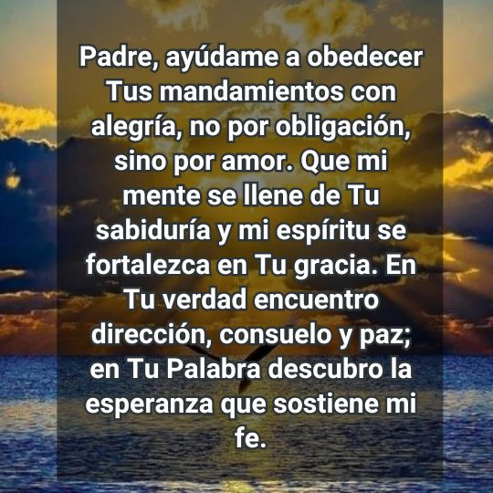 Padre, ayúdame a obedecer Tus mandamientos con alegría, no por obligación, sino por amor. Que mi mente se llene de Tu sabiduría y mi espíritu se fortalezca en Tu gracia. En Tu verdad encuentro dirección, consuelo y paz; en Tu Palabra descubro la esperanza que sostiene mi fe.