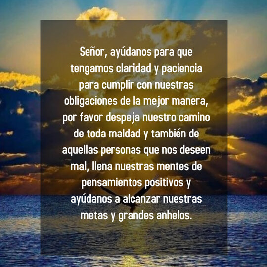 Permite que en esta nueva jornada tengamos claridad y paciencia para cumplir con nuestras obligaciones de la mejor manera, por favor despeja nuestro camino de toda maldad y también de aquellas personas que nos deseen mal, llena nuestras mentes de pensamientos positivos y ayúdanos a alcanzar nuestras metas y grandes anhelos.
