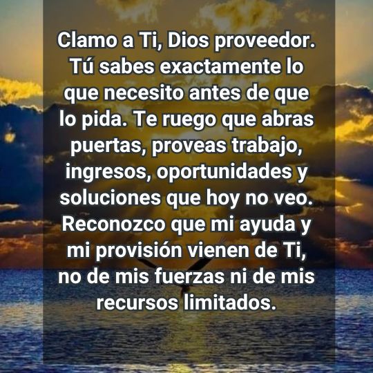 Clamo a Ti, Dios proveedor. Tú sabes exactamente lo que necesito antes de que lo pida. Te ruego que abras puertas, proveas trabajo, ingresos, oportunidades y soluciones que hoy no veo. Reconozco que mi ayuda y mi provisión vienen de Ti, no de mis fuerzas ni de mis recursos limitados.