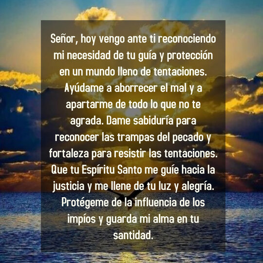 Señor, hoy vengo ante ti reconociendo mi necesidad de tu guía y protección en un mundo lleno de tentaciones. Ayúdame a aborrecer el mal y a apartarme de todo lo que no te agrada. Dame sabiduría para reconocer las trampas del pecado y fortaleza para resistir las tentaciones. Que tu Espíritu Santo me guíe hacia la justicia y me llene de tu luz y alegría. Protégeme de la influencia de los impíos y guarda mi alma en tu santidad. Permite que mi vida sea un reflejo de tu amor y rectitud. Te alabo y te doy gracias por tu fidelidad y por el gozo que siembras en el corazón de los justos. Que mi caminar diario sea siempre en kas sendas de tu voluntad, rechazando el mal y abrazando tu verdad. En el nombre de Jesús, amén.