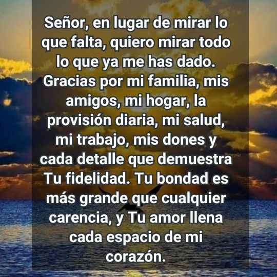 En lugar de mirar lo que falta, quiero mirar todo lo que ya me has dado. Gracias por mi familia, mis amigos, mi hogar, la provisión diaria, mi salud, mi trabajo, mis dones y cada detalle que demuestra Tu fidelidad. Tu bondad es más grande que cualquier carencia, y Tu amor llena cada espacio de mi corazón.