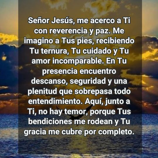 Señor Jesús, me acerco a Ti con reverencia y paz. Me imagino a Tus pies, recibiendo Tu ternura, Tu cuidado y Tu amor incomparable. En Tu presencia encuentro descanso, seguridad y una plenitud que sobrepasa todo entendimiento. Aquí, junto a Ti, no hay temor, porque Tus bendiciones me rodean y Tu gracia me cubre por completo.