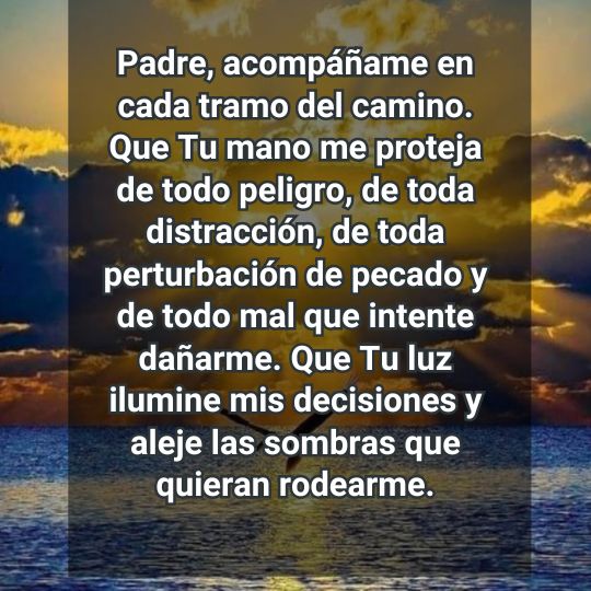 Padre, acompáñame en cada tramo del camino. Que Tu mano me proteja de todo peligro, de toda distracción y de todo mal. Que Tu luz ilumine mis decisiones y aleje las sombras que quieran rodearme.