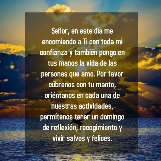 Señor, en este día me encomiendo a Ti con toda mi confianza y también pongo en tus manos la vida de las personas que amo. Por favor cúbrenos con tu manto, oriéntanos en cada una de nuestras actividades, permítenos tener un domingo de reflexión, recogimiento y vivir salvos y felices.