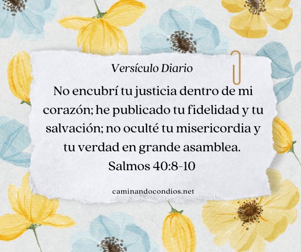 El hacer tu voluntad, Dios mío, me ha agradado, y tu ley está en medio de mi corazón. He anunciado tu justicia en grande congregación; he aquí, no refrené mis labios, Jehová, tú lo sabes. No encubrí tu justicia dentro de mi corazón; he publicado tu fidelidad y tu salvación; no oculté tu misericordia y tu verdad en grande asamblea. Salmos 40:8-10